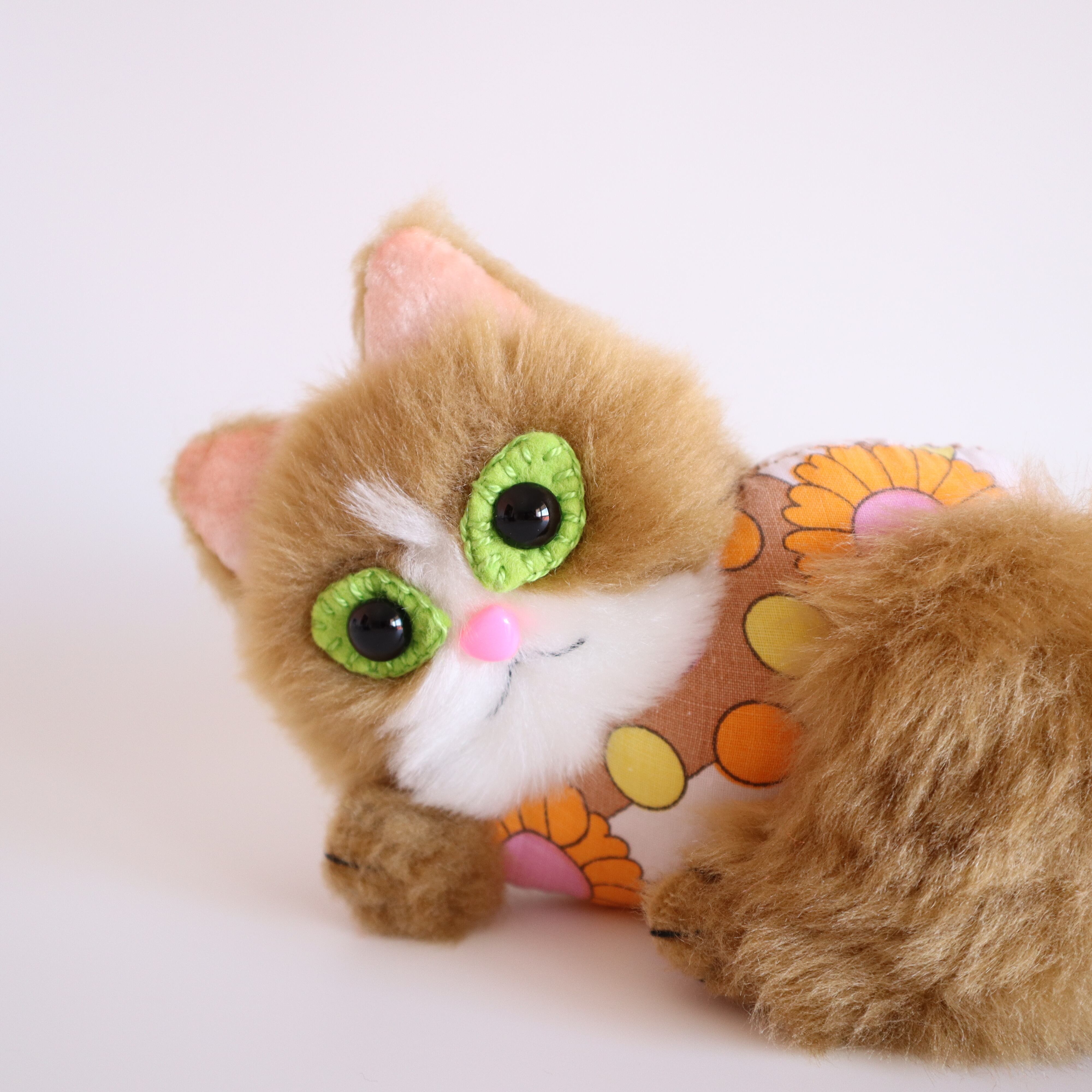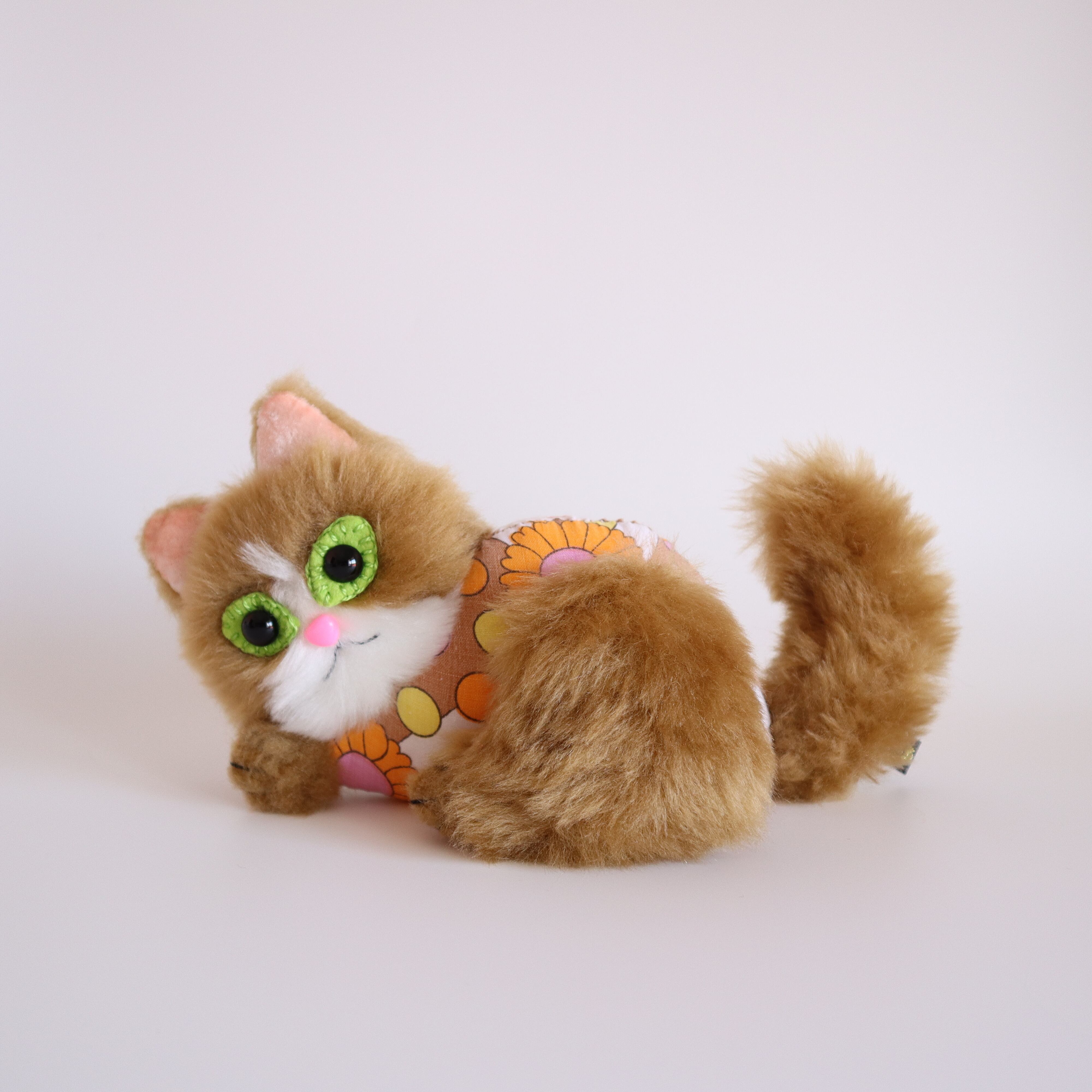 A plush toy cat wearing a vintage dress.